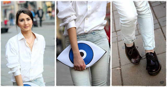 Drugaricu i mene je ovaj outfit asocirao na nekog dedu, pa se nadam da će da vam se dopadne moj grandpa look :)) Kombinacija je sinteza mojih omiljenih stvari: dekine košulje, lančića koji mi je baba poklonila za 18. rođendan, novih cipela koje sam duuuugo obilazila pre nego što sam ih iskukala 🙂 I naravno moje prve blogerske tAŠne 🙂 U srednjoj školi sam stalno, dok sam se dosađivala na časovima, crtala oko, i to uvek jedno, iz nepoznatih razloga. Ni sad ne shvatam zbog čega mi je oko u toj meri inspirativno ali nije ni važno, jer je opredmeceno u vidu torbice divno.