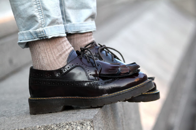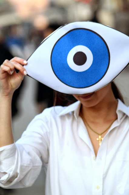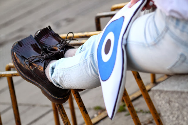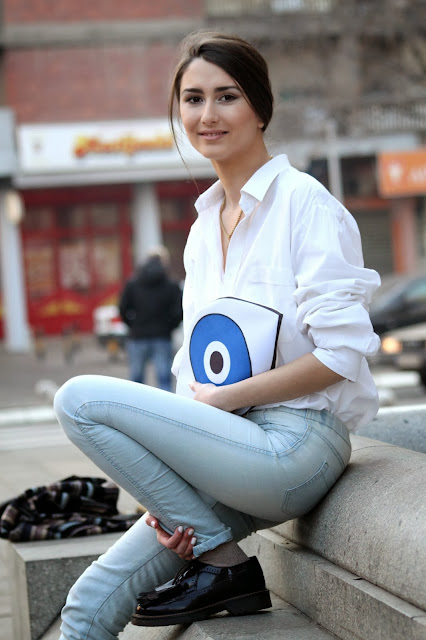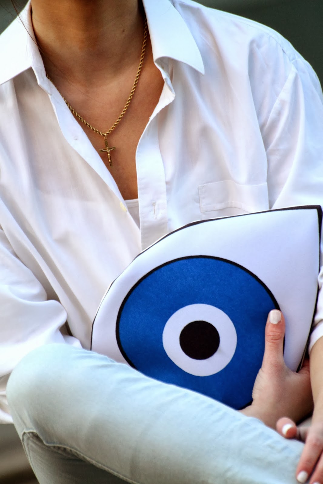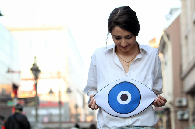 Drugaricu i mene je ovaj outfit asocirao na nekog dedu, pa se nadam da će da vam se dopadne moj grandpa look :)) Kombinacija je sinteza mojih omiljenih stvari: dekine košulje, lančića koji mi je baba poklonila za 18. rođendan, novih cipela koje sam duuuugo obilazila pre nego što sam ih iskukala 🙂 I naravno moje prve blogerske tAŠne 🙂 U srednjoj školi sam stalno, dok sam se dosađivala na časovima, crtala oko, i to uvek jedno, iz nepoznatih razloga. Ni sad ne shvatam zbog čega mi je oko u toj meri inspirativno ali nije ni važno, jer je opredmeceno u vidu torbice divno.
