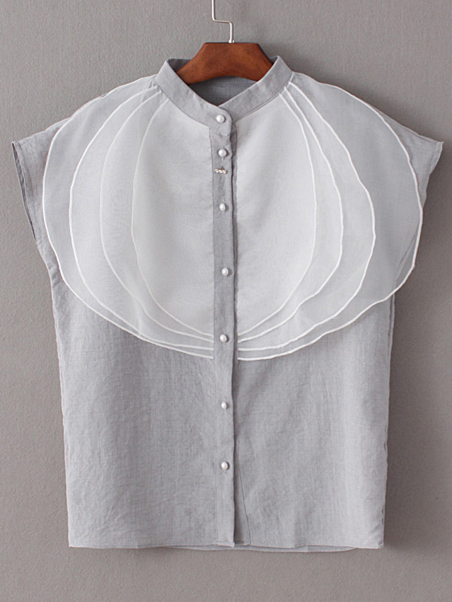 2.Grey Multi-layered Organza Patchwork Cap Sleeve Blouse
